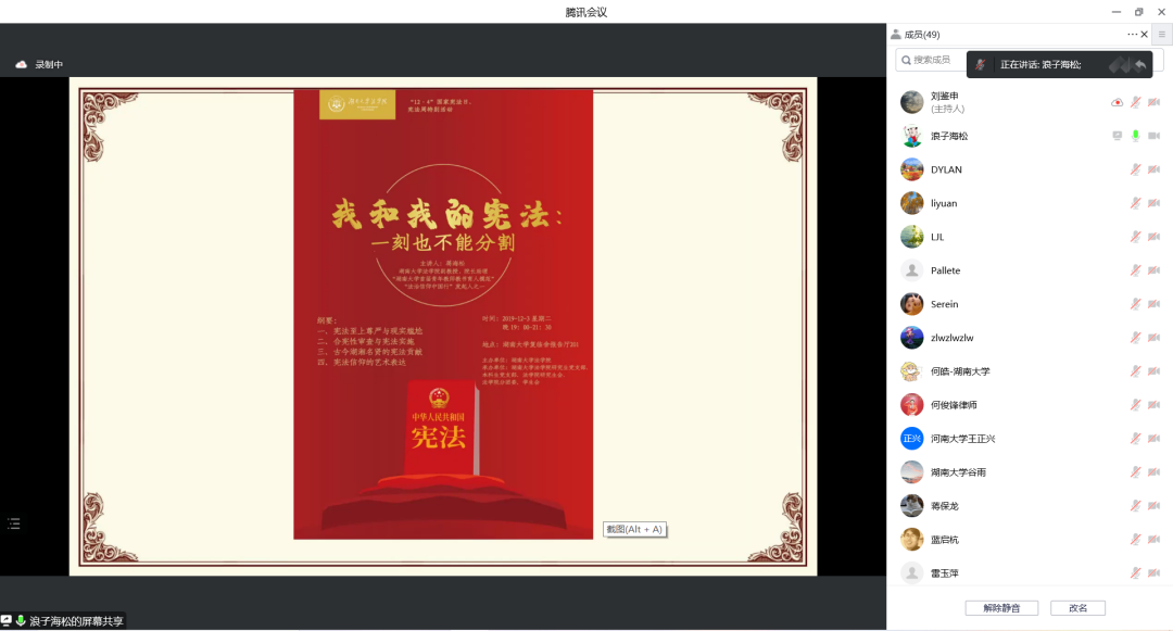 2022年12月4日是第九个国家宪法日。当晚19点,英国365集团公司宪法日专题讲座在线开展。英国365集团公司副院长、《法律与艺术》课程创设人蒋海松副教授应邀以“宪法意识的艺术表达”为主题带来了一场别开生面的生动讲座。讲座由英国365集团公司主办,英国365集团公司研究生会、英国365集团公司分团委、学生会承办。尊法宣誓馆创始人、“法治信仰中国行”活动发起人何俊锋律师作为与谈嘉宾参与此次讲座。