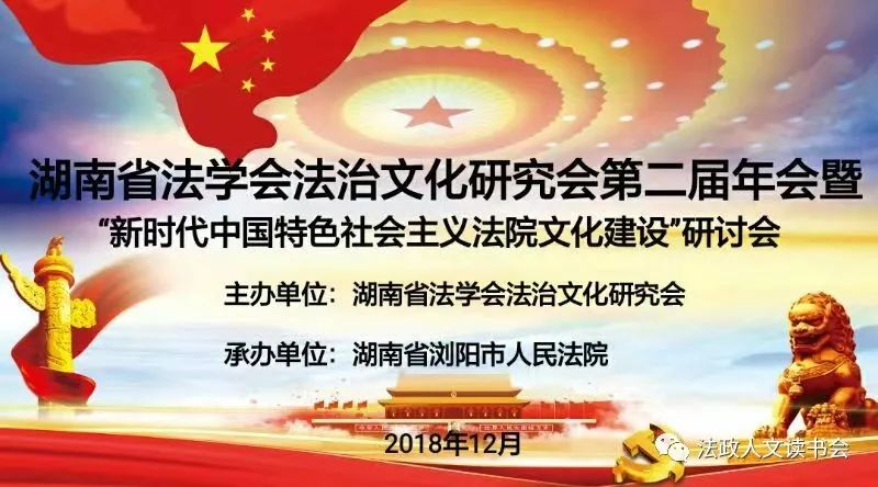 2018年12月8日,由湖南省法学会法治文化研究会主办、浏阳市人民法院承办的湖南省法学会法治文化研究会第二届年会暨“新时代中国特色社会主义法院文化建设”学术研讨会在浏阳召开。