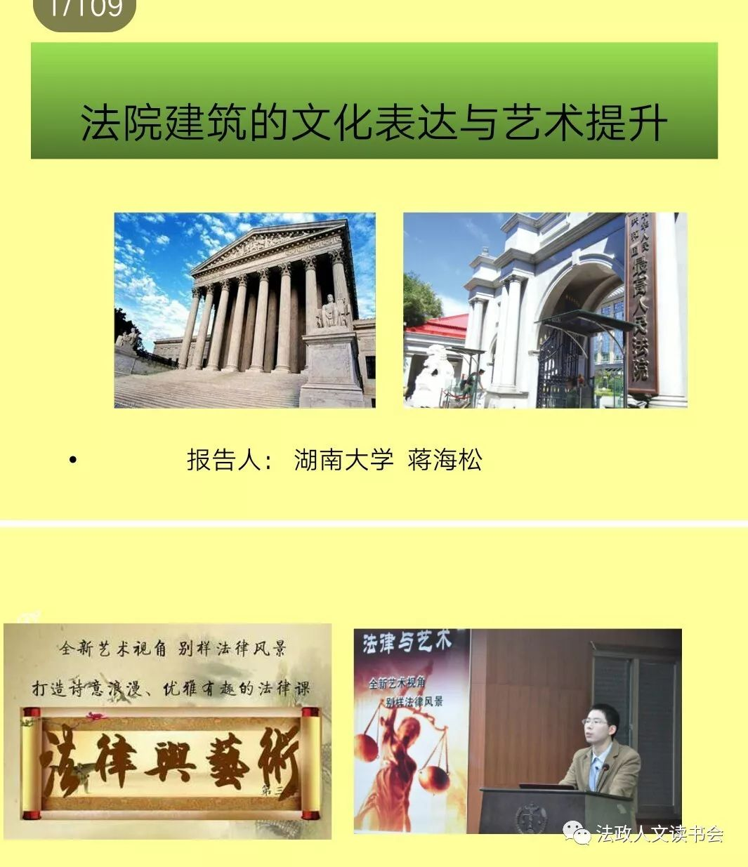 浏阳法院院长李波从党建文化、法治文化、廉政文化三个方面向与会嘉宾介绍了浏阳法院的文化建设成果。在主旨报告环节,夏新华教授和蒋海松副教授分别作了题为《法院文化的理论辨析及体系建构》和《当代法院建筑的文化表达与艺术提升刍议》的主题报告。蒋海松在演讲中提出,建筑具有实用功能,保障人类安定,实现居有其屋。另一方面,建筑又具有美学意义,是一门综合艺术。 法律建筑是法律实用功能与艺术的完美融合。从功能上说,法院建筑是国家为行使审判权而设立的专用场所,而从文化上说,法院建筑更是传播法律精神、表达法律艺术、进行普法教育的重要空间。蒋海松提出,一个完美的法院建筑应该妥善地处理如下三组辩证关系,即:一、公共权威性VS亲和轻松感;二、区域功能化VS便捷灵活性 ; 三、功能实用性VS 艺术象征性。浪子海松在演讲中图文并茂地呈现了上述三组矛盾,并分析当下中国法院建筑的常见弊病,并通过个案和他自己参与的一些设计对如何提升法院建筑的艺术性做了建议。报告引起听众的浓厚兴趣。