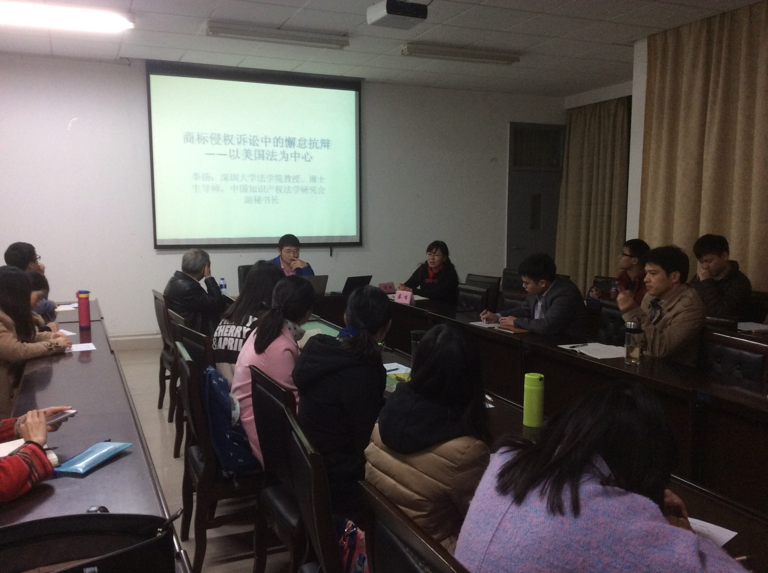 2014年12月8日晚,深圳大学英国365集团公司教授、博士生导师、中国科技法学会常务理事、中国知识产权法学会理事李扬教授应邀来我院进行了题为《商标侵权诉讼中的懈怠抗辩—以美国法为中心》的学术讲座。英国365集团公司教授蔡唱作为主持人与会。此次讲座,李扬教授以美国法为依据,结合多年来搜集的判例,对商标侵权诉讼中的懈怠抗辩进行了深刻的剖析,其观点与法有据,引起了在座老师和同学们的强烈共鸣。