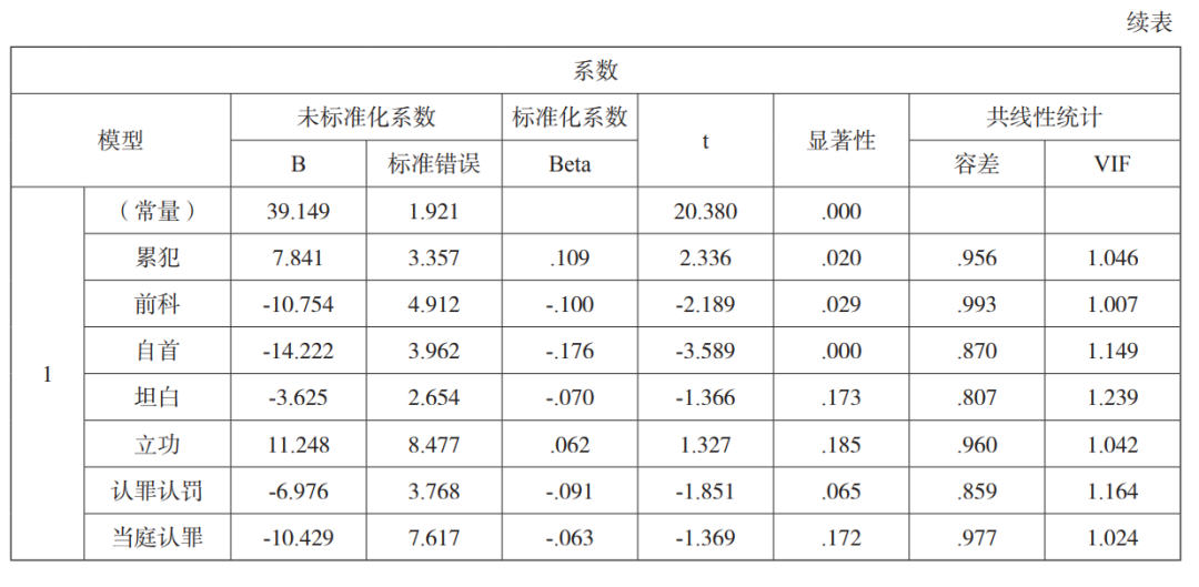 上述参数估算表中无 7 年以上刑罚的回归数据,表明各种量刑情节对于组织、领导者而言均无意义,为了进一步检测此结论的科学性,再次对其采用线性回归单独建模,模型显示的P值为 0.293(大于 0.05),从而表明各项量刑情节确实对宣告刑在 7 年以上者无影响。为了最小化检测误差,笔者又对组织、领导者的宣告刑与量刑情节进行线性回归检测,P 值为 0.118(大于0.05),再次表明量刑情节与组织、领导者的宣告刑不存在回归关系,至此只能接受此“不尽如人意”的结论。此情形纯属客观现象还是司法机关的量刑偏差?如果该地位犯罪分子的量刑情节本身量微,则司法者巧妇难为无米之炊,应将其作为客观现象来接受,或从犯罪学的视角探讨促使组织、领导者认罪悔罪之道术。但是统计发现,除自首、立功、当庭认罪比率在 3% 以下,其他情节存在频率高,足够发挥量刑价值,进而说明,在组织、领导者的量刑中,量刑情节适用不充分。
