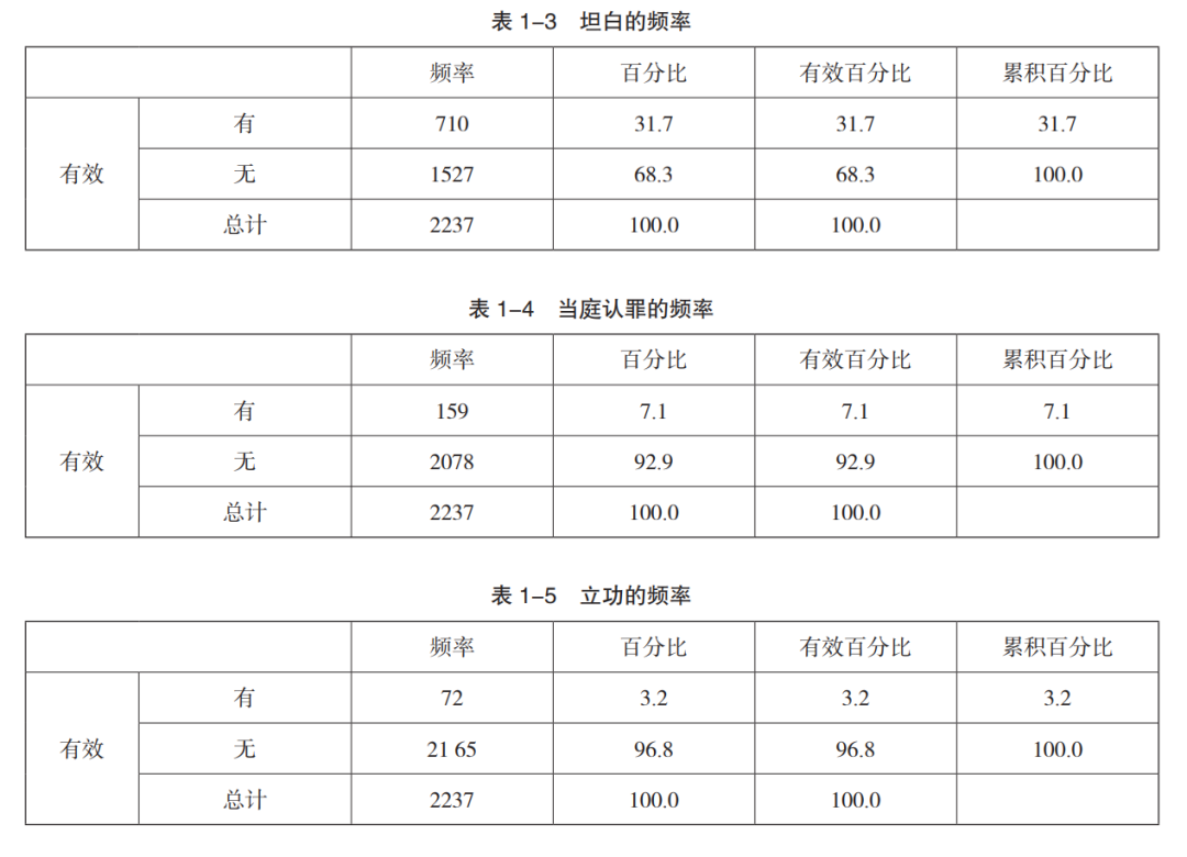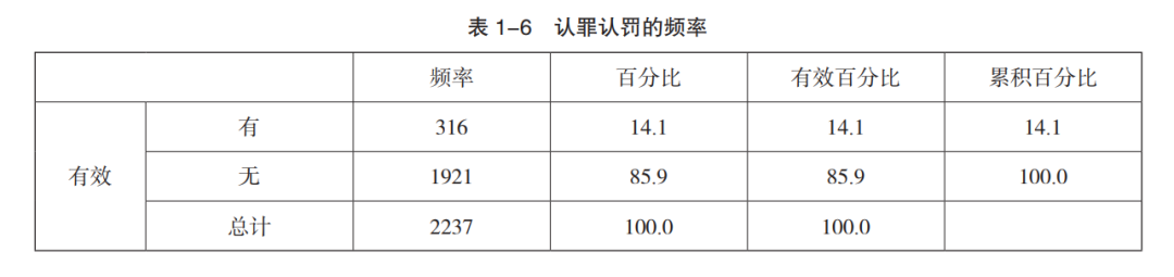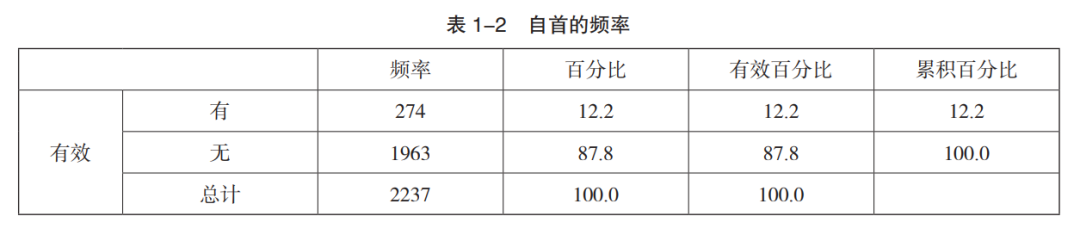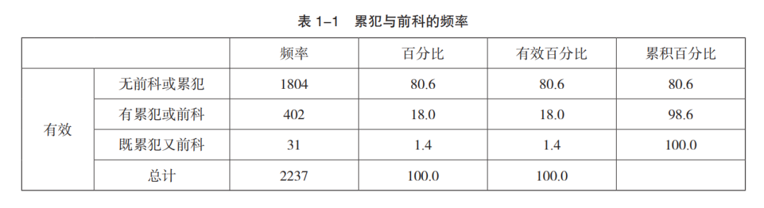 样本数据中曾经犯罪者433 人,比例高达 19.4%,其中有 1.4% 的犯罪分子既有前科亦为累犯,具体见表 1-1。