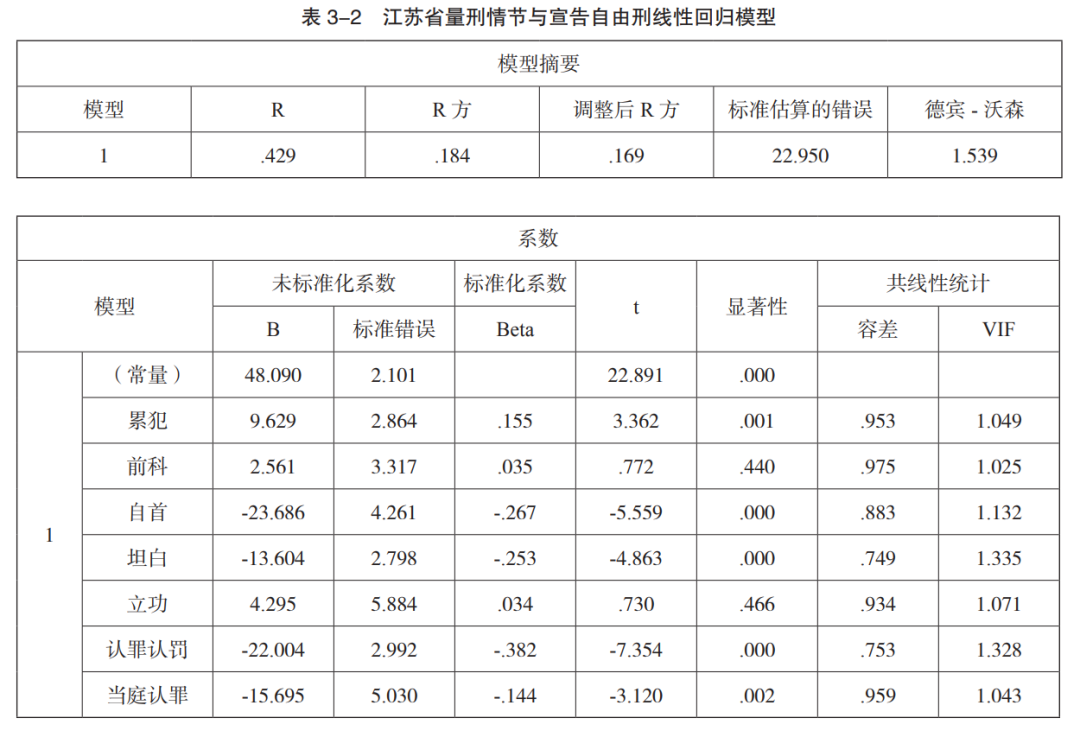 根据研究目的及自变量和因变量的性质,此处可采用线性回归模型。在复现逻辑中,江苏省经济发达且司法人员素质较高、也是我国量刑规范化改革的前沿地区,其量刑质量应属全国上乘,检测结果(表 3-2)也证明确实如此。