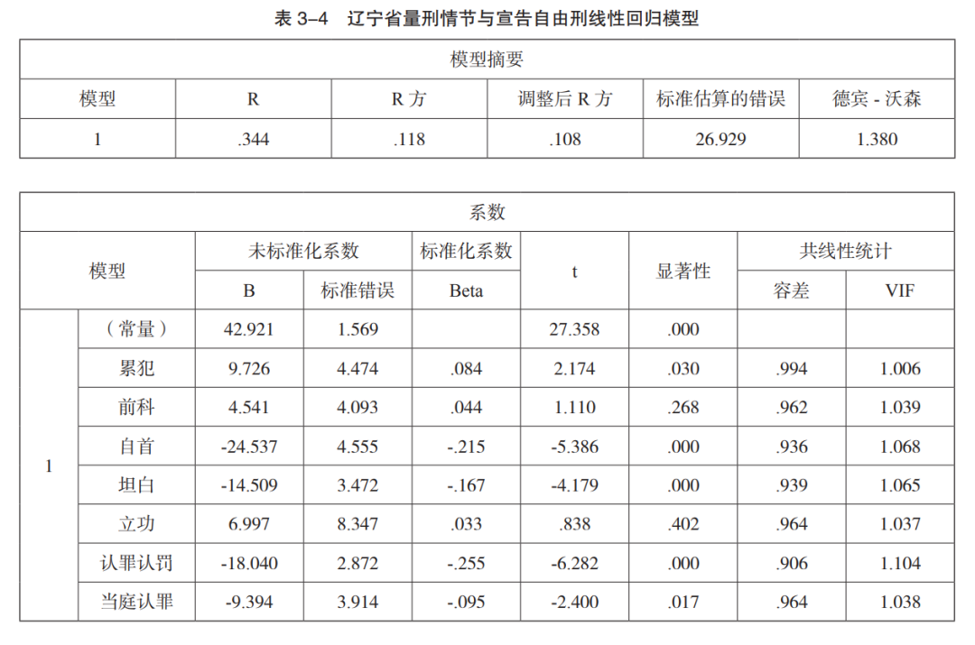 根据辽宁省量刑情节适用回归模型(表 3-4),辽宁省的预防刑占宣告刑的 11.8%,较湖南高,较江苏低。通过系数表可知,累犯、自首、坦白、认罪认罚、当庭认罪均与宣告自由刑存在回归关系,只有前科与宣告刑不存在回归关系。根据 Beta 值,各种回归关系正常,存在回归关系的量刑情节对自由刑的作用力大小依次为,认罪认罚>自首>坦白>当庭认罪>累犯。由此可见,辽宁省对于组织、领导黑社会性质组织罪的量刑情节适用水平与江苏省相当,认罪认罚的量刑价值显著,量刑情节适用较充分,幅度相对合理,但前科未发挥量刑效用,累犯从重幅度明显偏不足。
