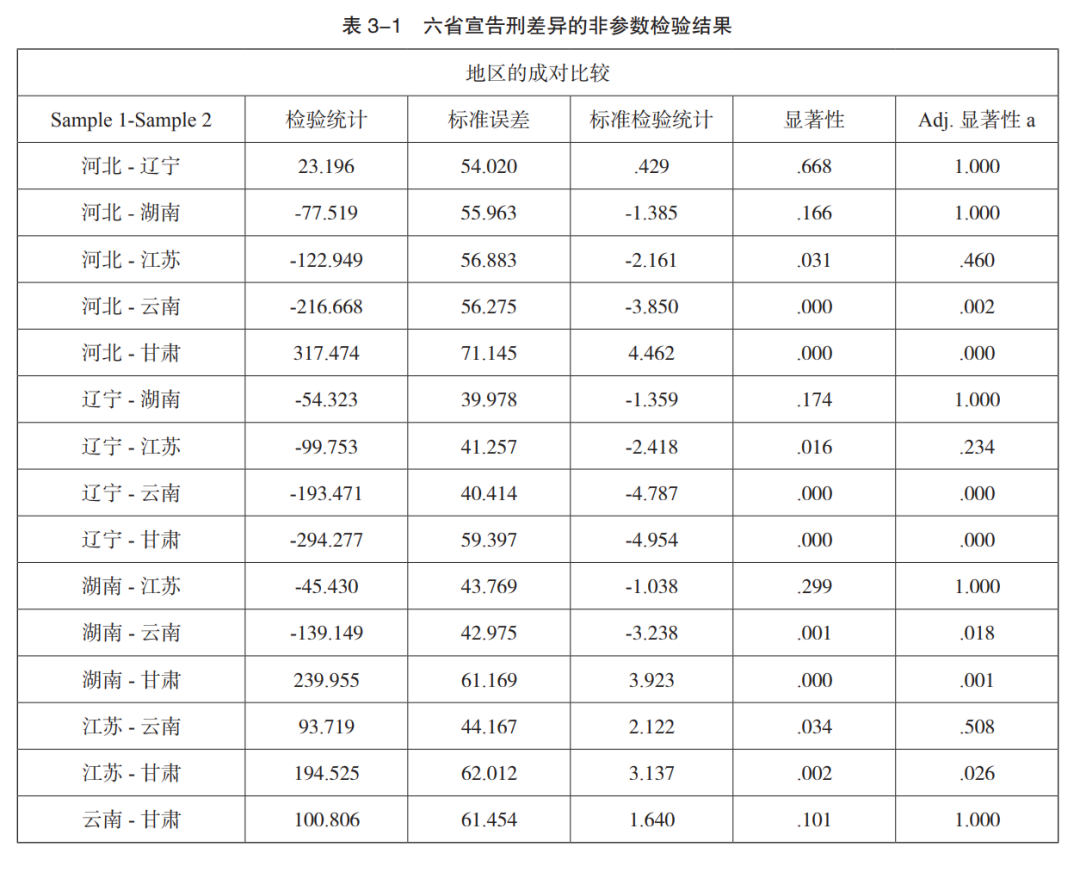比较差异存在多种检验方法。采取 K-S 法对自由刑进行正态性检测,发现其不呈正态分布,也不呈现方差齐的特征,因而法学界较多学者采用方差不齐时的 Tamhane's T2 方差检验法。但是统计学界主流学派认为“方差不齐不应采用方差分析,而应采用非参数检验法”。笔者对两者予以实证比较并择优运用。两种检测方法所得结果均表明黑社会性质组织犯罪的宣告刑存在地区差异,但差异的具体样态不同,用 Tamhane's T2 检验存在差异者,在非参数检验下也存在差异,但前者检测不存在差异者却可能为后者检测出差异,从而说明前者误差较大,后者精密度更高,故本文选择非参数检验法,具体检测结果见表 3-1。
