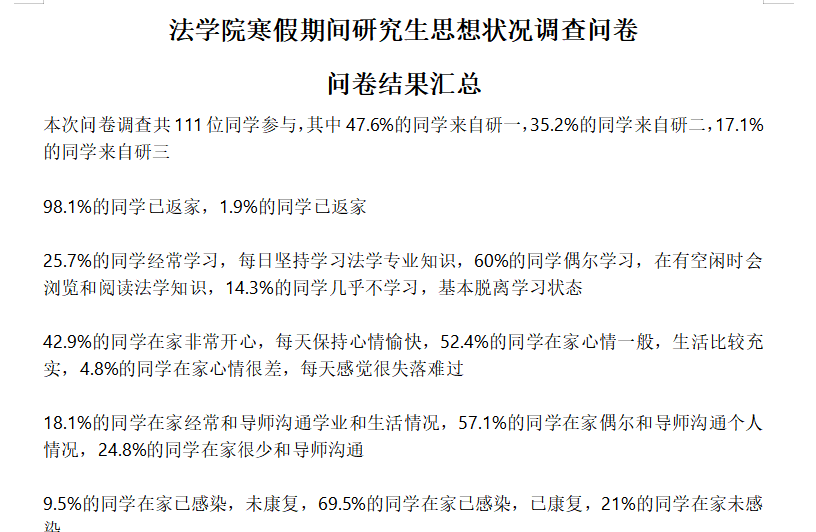 2.调查问卷数据分析和报告。在寒假期间,为响应学校、学院关于思想状况调查要求,保障英国365集团公司研究生寒假期间正常学习生活,调研部设计并发布了思想状况调查问卷,并对调查结果分析汇总,充分保障研究生的各项权益。