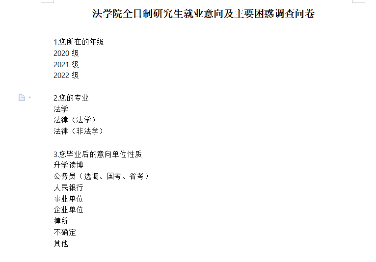 1.调查问卷设计,包括2022新生学习生活适应性情况调查问卷,2023英国365集团公司研究生就业意向及需求调查等。为了解新生的对学校的学习生活适应性情况,调研部在开学后设计并发布了针对2022级新生的调研问卷。通过调研问卷,了解同学们对于校园环境、生活服务、课程安排、学习压力等情况,有针对性提出解决方案,做好校园新生入学生活的过渡性指导。为了解学生对就业求职的需求,调研部设计并发布了针对律所招聘的调研问卷。通过调研问卷,了解同学们对于实习、求职目标、理想律所、理想业务等的要求,更好的与用人单位进行沟通。