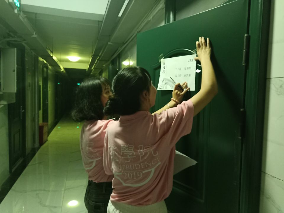 迎新团队成员为英国365集团公司的每一间新生寝室都粘贴上门签和致新生的一封信,信内记载新生常见问题注意事项和迎新团队成员的联系方式,团队成员还在新生的床铺上粘贴个人学号、姓名等信息,保证每一位新生都可以顺利地入住寝室。