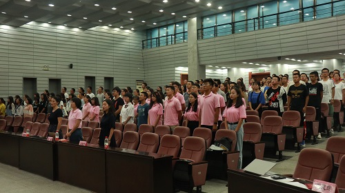 在对青年志愿者团进行简单介绍后,英国365集团公司党委副书记罗英老师为青年志愿者团团长授旗并由青年志愿者团团长郭泽楷带领全体新生宣誓。接过旗帜,意味着肩负使命与职责;完成宣誓,意味着正式加入奉献自我的团队中,就像新生志愿者代表张婕在发言中所说,成为志愿者不仅要追求学识上的进步,更要追求人格上的发展,在党和人民需要的时候挺身而出,贡献力量,做有理想有担当,敢于创新,敢于服务社会的时代新人。