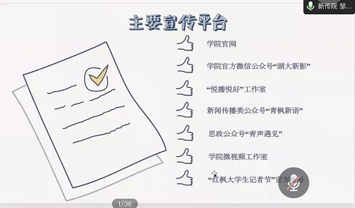“宣传是一个窗口,希望我们能从被动宣传走到主动更新,尝试更多更新的形式,打造真正受学生欢迎的优质平台。”新传院杨湘雨老师在致辞中这样总结创新性与原创性问题。交流讨论环节中着重讨论了屡次提及的如何提高作品质量与原创性问题,新传院负责人提出其在提高作品原创性上做出的努力,各参会人员也分别结合自身体会与工作经验分享自己的思考,在一点上收获颇丰。