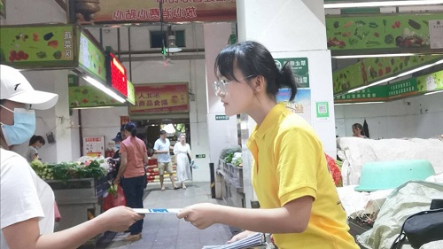 在了解并学习诸多宣传经验后,正式开始宣传工作。宣传地点特意选取社区活动广场和菜市场这两个日常居民流量大的地方,并将宣传手册分发给居民们。在分发过程中,耐心地向居民讲解本次宣传的主要内容。同时,尽力对居民的一些疑惑进行讲解,超出能力范围外的问题还为大家提供相关服务网站的信息,推荐大家进行咨询。一位爷爷表示,“社会在不断发展,我们也明白法律知识的重要性,但由于对了解渠道的不明,难以接触这些知识,像这样日常普法宣传对于我们来说帮助较大。”