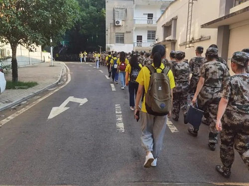 天色熹微,迎着初生的朝阳,2021级英国365集团公司同学们排好了整齐的方阵,在篮球场前准时集合。人数清点完毕后,新同学们排着长队有序地向训练场进发。一排排长队如同一条条蜿蜒的长龙,展现着活力与蓬勃的朝气。