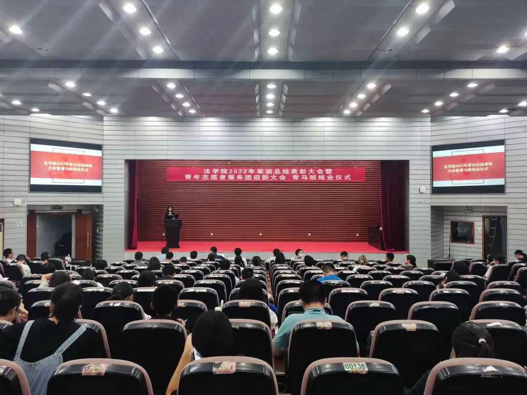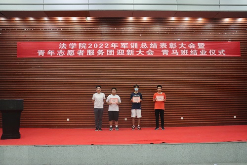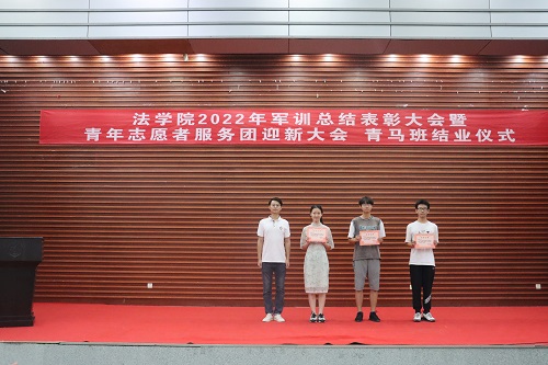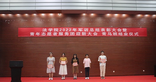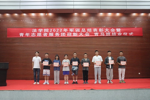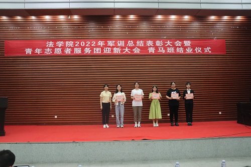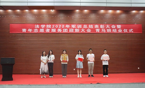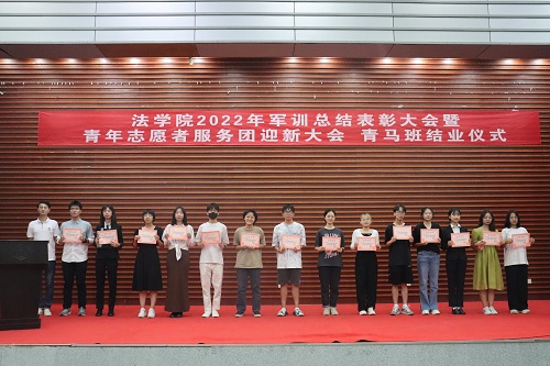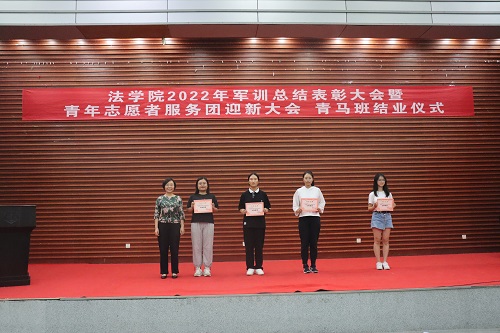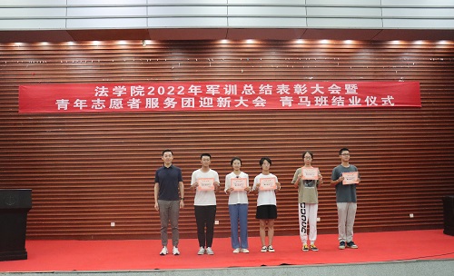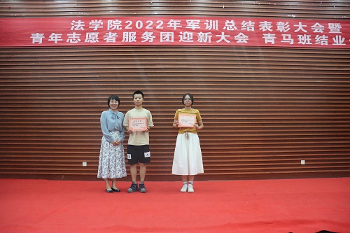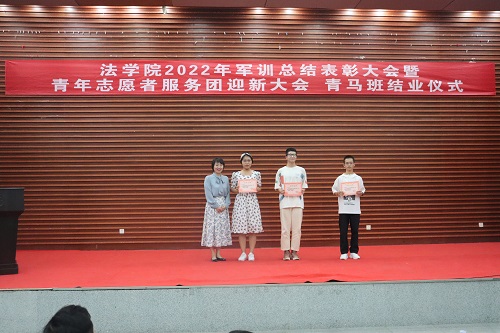 张丹老师宣读表彰决定。学院授予2022级法学三班、法学五班“军训优胜队列班级”荣誉称号,授予2022级法学一班、法学二班、法学四班“作风纪律先进班级”荣誉称号,授予天马一区三栋104寝室等十个寝室军训内务评比“优秀寝室”称号,授予刘亮、贾林远等十五人“军训先进个人”称号,授予姚睿婷、邓舒蔓等十人“青马班优秀学员”称号。学院还对参与2022级新生军训工作的迎新团队成员、英国365集团公司全体教官和优秀志愿者给予表彰。罗英老师、张丹老师、曹晓军老师和2022级新生班主任为受到表彰的集体和个人颁发荣誉证书。