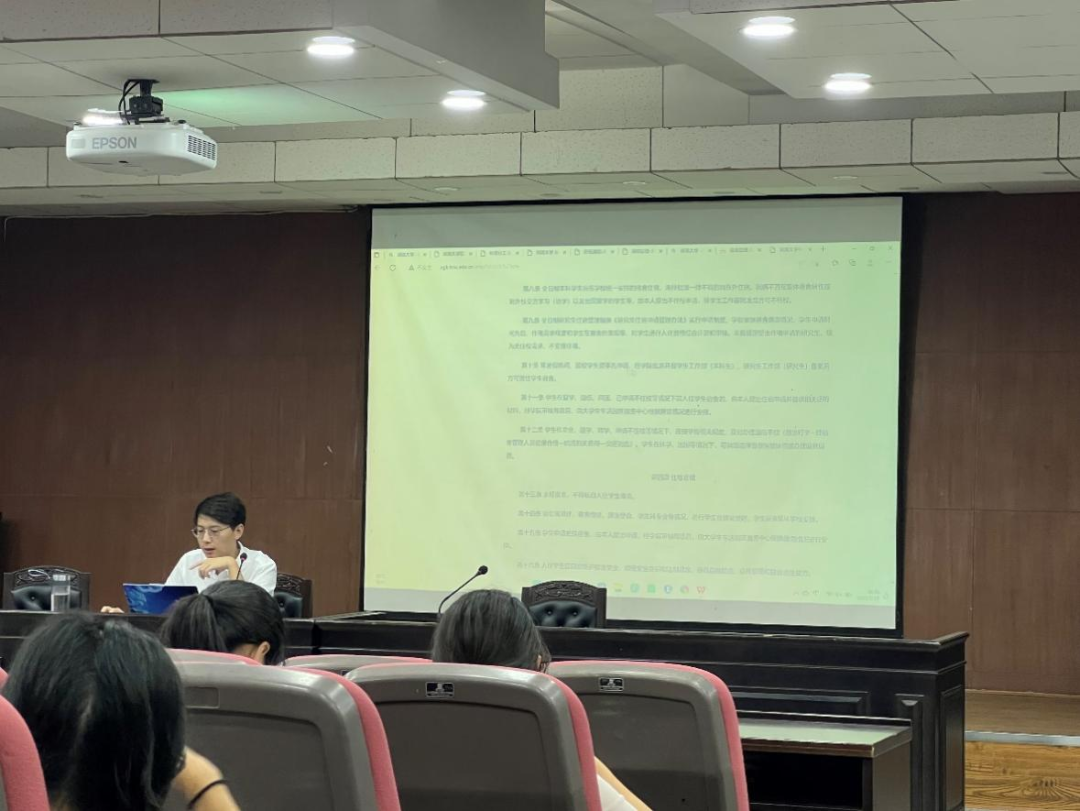 为深化新生对校纪校规的认识与理解,加强师生联系,共筑和谐校园,9月27日晚,英国365集团公司于模拟法庭召开2022级本科新生校纪校规及学生事务主题教育活动。本次主题教育由辅导员曹晓军老师主讲,全体本科新生参加。