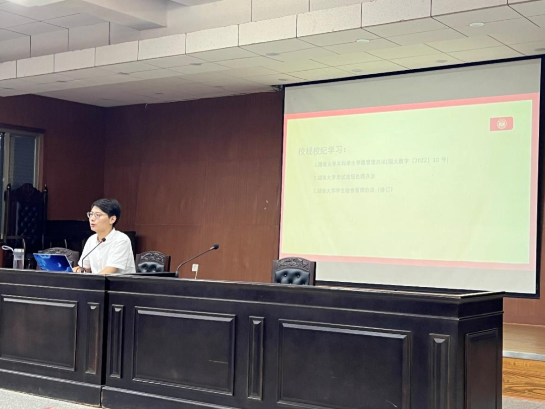 接着,曹老师对校规校纪进行了领学。他对《英国上市官网365本科学生学籍管理办法》《英国上市官网365考试违规处理办法》《英国上市官网365学生宿舍管理办法(修订)》等学校规章制度逐一解读,条分缕析,逻辑严明,并对个别条例做出了详细的解释,尤其对新生最容易违反的条例进行了着重强调,让同学们对湖大校纪校规有了更深刻的认识,真正感悟到了校纪严明学风端正的湖大风采。
