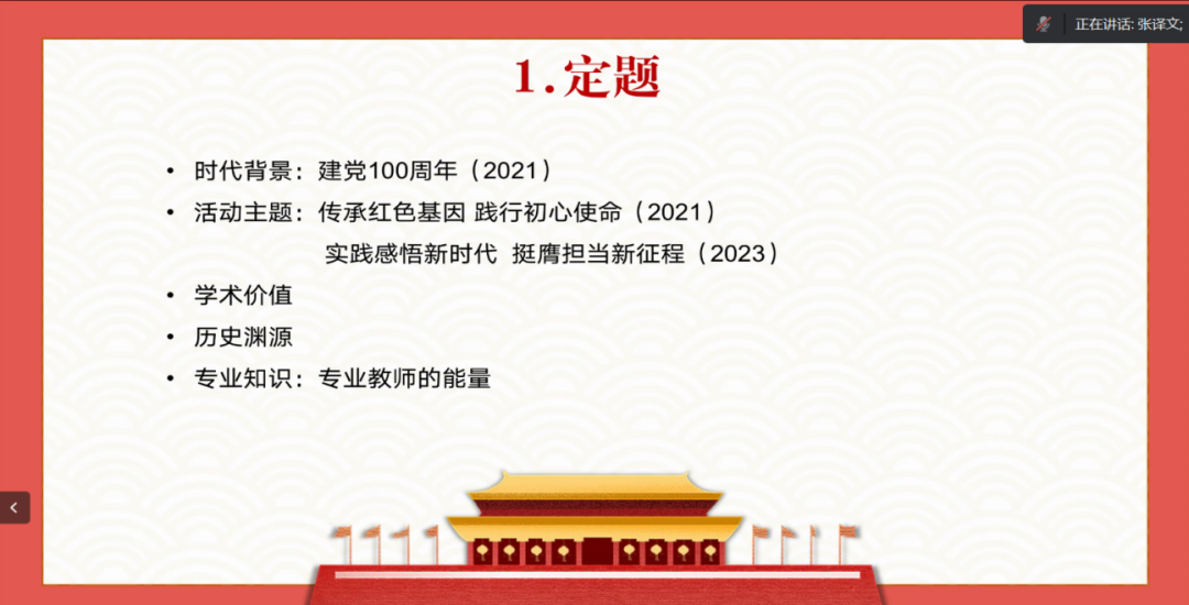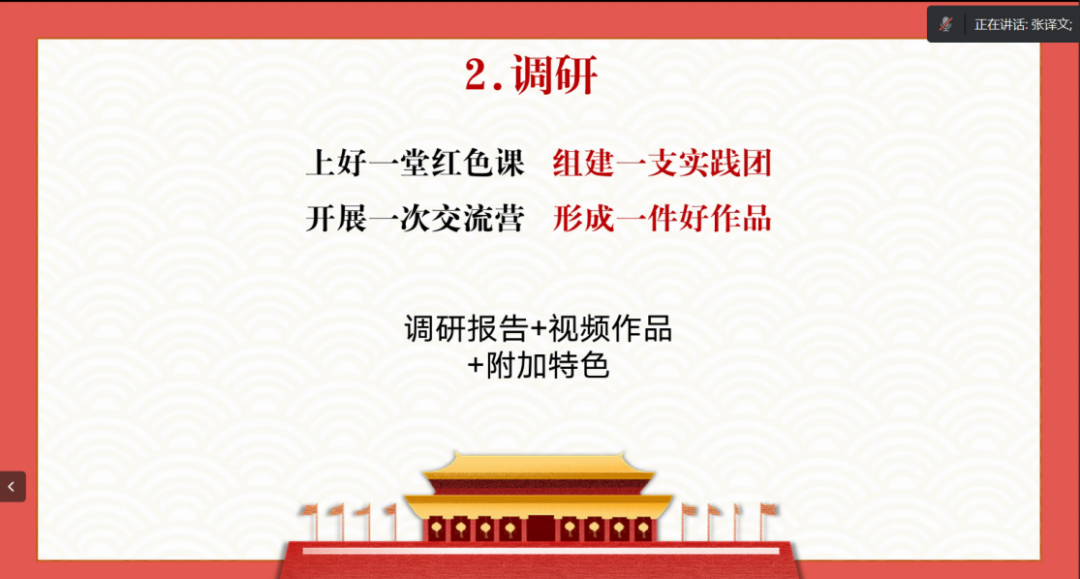 最后张译文同学则分享了她参与挑战杯红色专项赛道的经验,她从“定题、调研、形成作品”这三个方面详细介绍了她参赛的经验,提醒同学们在定题时要和调研结合,可以“以小见大”——从小的事件来钻研其中蕴含的红色精神,尽量减少“空话和套话”的使用,避免“假大空”。同时也分享了她在调研时的故事,让人受益匪浅。