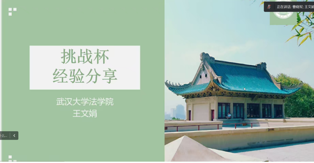 会议伊始,罗英老师首先向在此次经验分享交流会进行分享总结的三位优秀学生表示了感谢。接着,罗老师向同学们分享了自己对挑战杯的看法,她认为挑战杯对于大学生来说是一次培养实践创新精神的宝贵机会。同时她还鼓励同学们积极参与挑战杯等各种创新创业类竞赛,努力成为一名更加优秀的法律人。