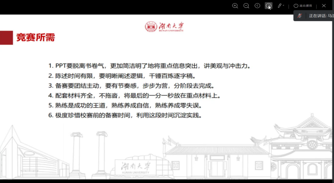 首先进行分享的是王文娟同学,在分享过程中,她先对挑战杯全国大学生系列科技学术竞赛以及赛制进行介绍。接着,她还强调了团队的重要性,队长要兼具学术性和管理性,合理分配每位队员的工作。对于作品书的内容与格式,她都作出了相关说明。最后她就现场答辩环节提出了一些注意事项,希望参赛人员尽量脱稿展示,语速要恰当,声音要洪亮,合理分配各个环节的时间。