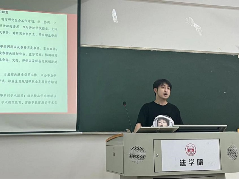 接下来,刘岳峰老师发表了致辞,对研究生会的各位同学提出了以下几点期望。第一,不忘初心,希望各位同学不要忘记加入研会的初衷,在面临挫折和压力时,保持对工作的热心、热情、和热爱。在服务同学的过程中,锻炼自己的能力,提升自己的素养。着重培养写作能力,加强沟通能力,处理好学习和工作的关系。第二,各部门内部加强团建,各部门之间加强协作。各部门工作例会、工作研讨会、工作总结会要定期开展,提高研究生会工作效率和质量。第三,希望各位干事和干部能做到在其位谋其政,结合自己部门的特色,对于自己部门发展、工作开展提出自己的想法,为研究生会的建设贡献自己的力量。