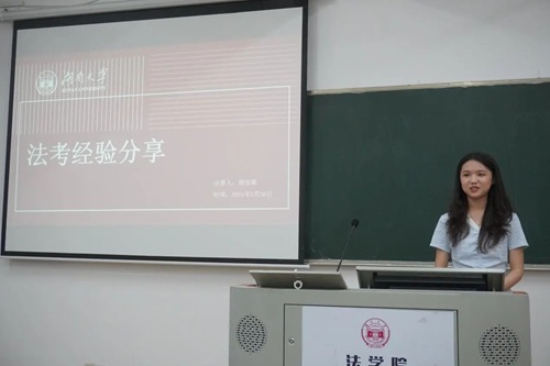 第二个进行分享的胡佳璐同学则针对短期备考,将分享划分为整体策略、单科学习和补充建议三个部分。首先,她将自己的整体策略总结为“长线打基础、客观题冲刺、主观题练习”三个板块,这三个部分也对应着“理解知识点、记忆重难点、应用所学点”的复习逻辑。其中,对于客观题冲刺的重难点部分,胡佳璐同学提出可以灵活应用各种备考资料进行理解;而对于主观题的练习,她建议在刷题时锻炼考点识别和语言组织能力,并通过做完后和答案逐步对照的方式来规范答题、完善自己的思维体系。而对于具体单科学习,胡佳璐同学强调“舍与得”,以个人的学习基础确定复习的侧重科目,从而达到得分“性价比”最大化的效果。她强调将备考重点放在民法、刑法等需要重点理解的科目,通过精讲课和日常练习进行理解学习;而对于行政法、商经知、三国法以及理论法等科目,则主要借助背诵卷或考前精粹等进行突击。最后,关于补充建议的部分,她强调备考中要专注于自身,稳住心态安心备考。