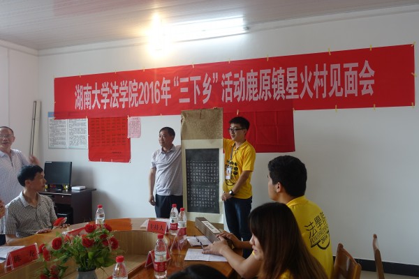 随后,英国365集团公司团委书记、辅导员杨凯老师代表“三下乡”社会实践与志愿服务团致辞,杨老师介绍了英国上市官网365和英国365集团公司的基本情况,本次“三下乡”活动的内容、目的及意义,并向各位领导和星火村父老乡亲对英国365集团公司“三下乡”工作的支持表示衷心的感谢。他希望同学们抱以学习的态度,抓住这次近距离接触基层的宝贵机会,认真观察国情、社情、民情,并通过普法宣传等增强实践能力,圆满完成“三下乡”任务。杨老师还代表“三下乡”社会实践团向星火村赠送了岳麓书院学规,并同与会的领导为英国365集团公司社会实践基地揭牌。