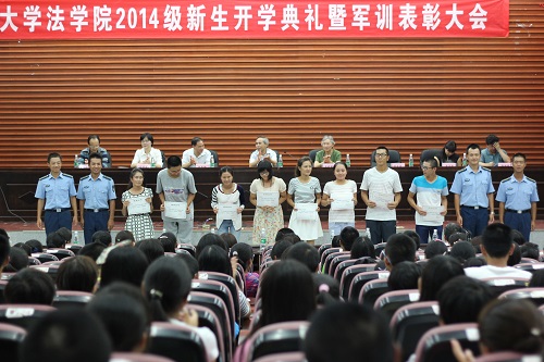学院党委书记屈茂辉教授、当代中国法学名家王晓晔教授和张智辉教授,老院长刘定华教授、院党委副书记付蓉芬老师、副院长雷玉琼副教授、政治系系主任刘少华教授、公共管理系系主任郭渐强教授、法学系李小明教授、白巴根教授、肖艳辉副教授、张秋航副教授、唐双娥副教授,行政管理系颜克高副教授,政治学系刘宏斌副教授,以及学院教务办、学工办全体老师,2014级各班班主任,英国365集团公司军训教官同志,2014级迎新团队成员和2014级全体同学参加了本次大会。大会由2014级辅导员老师杨凯主持。