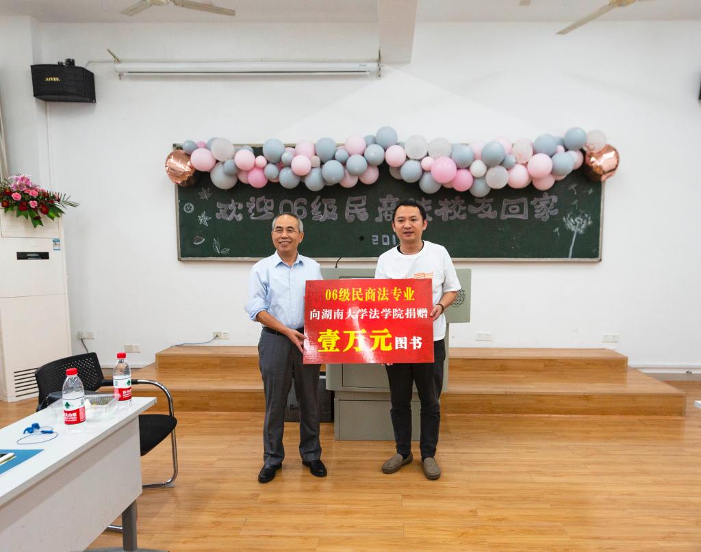 10月6日,2006级民商法硕士们在回访母校时也通过捐赠来寄托对于母校的拳拳深情,特捐赠一万元图书为母校法学教育发展贡献力量,屈茂辉院长代表英国365集团公司接受校友捐赠并向校友代表颁发证书。