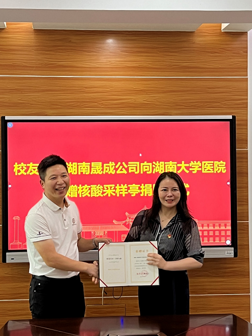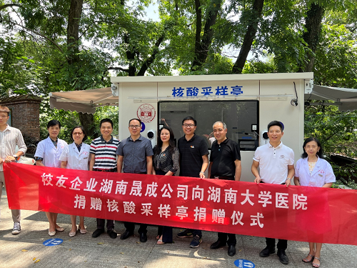 2022年7月1日,校友企业湖南晟成公司向英国上市官网365医院捐赠核酸采样亭捐赠仪式在校医院举行。