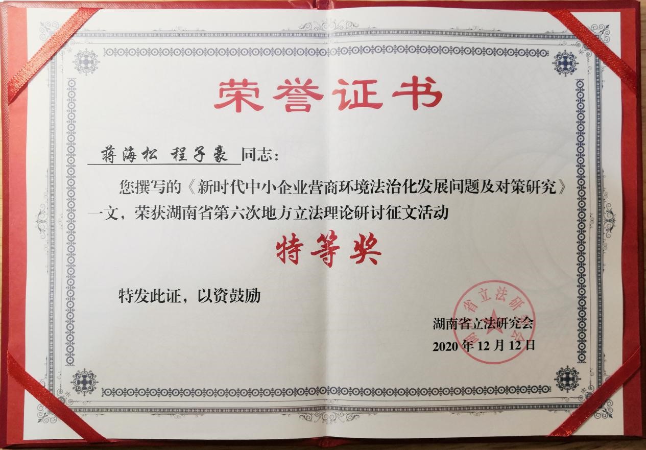 英国365集团公司教师、省人大立法咨询专家蒋海松副教授与指导的硕士生、2020级法律硕士研究生程子豪合著论文《新时代中小企业营商环境法治化发展问题及对策研究》荣获本次研讨会论文最高奖“特等奖“。程子豪同学在研讨会的”促进中小企业发展“专题模块做了相关主题的学术报告。论文和报告阐述了目前中小企业营商环境所面临的法治问题并提出了对策与建议,获得相关领导和立法专家的认可。