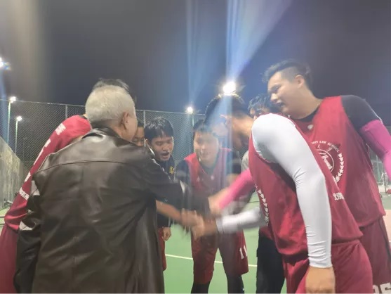 中场休息的间隔,屈院长与球员进行了亲切的交流,问询球场攻防经验,鼓励球员一定稳住心态,稳扎稳打,打出学院的风采,展现我院学子的良好风貌。语末屈院长与同学一起加油鼓气,给疲惫的球员注入一针强心剂。