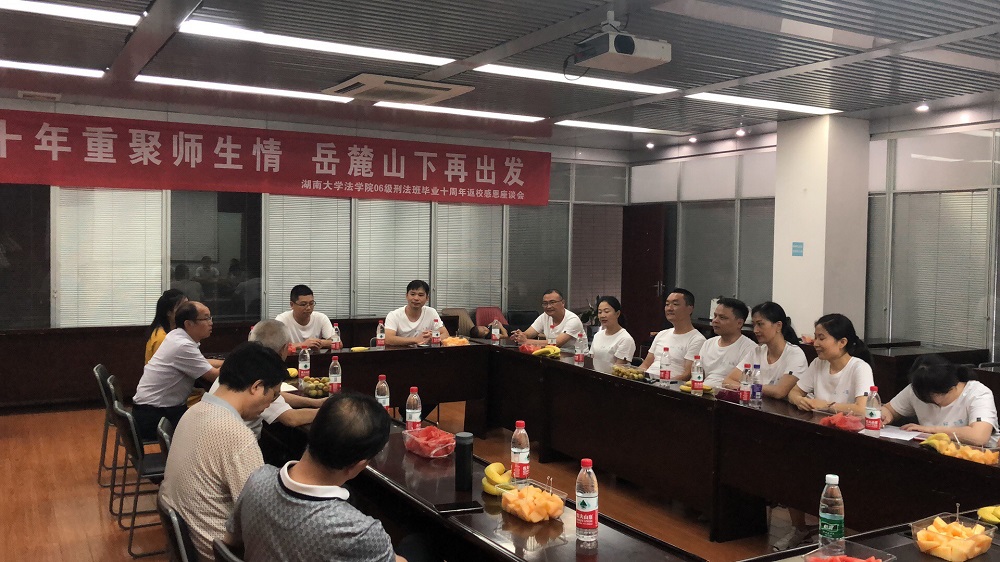 2019年8月10日,我院2006级刑法专业研究生班校友集体返校。下午3:30,返校校友在英国365集团公司404教室参加了英国365集团公司组织的座谈会。湖大英国365集团公司院长屈茂辉、副院长湛建云以及教师代表孙昌军、段启俊、邓祥瑞、赵香如、王燕飞出席会议。