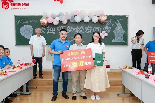 随后,同学代表也进行发言,表达重回母校的激动之情,代表校友衷心感谢老师谆谆教诲,祝愿母校越办越好,祝愿老师身体健康。发言过后,国际经济法951班和国际法951班校友代表分别向母校捐资一万元,并赠与老师们礼品表达自己的赤子情怀和母校情结。学院也用证书和寓意“书写更加精彩的人生华章”的毛笔礼品回赠各位校友,祝福他们事业有成,家庭幸福。
