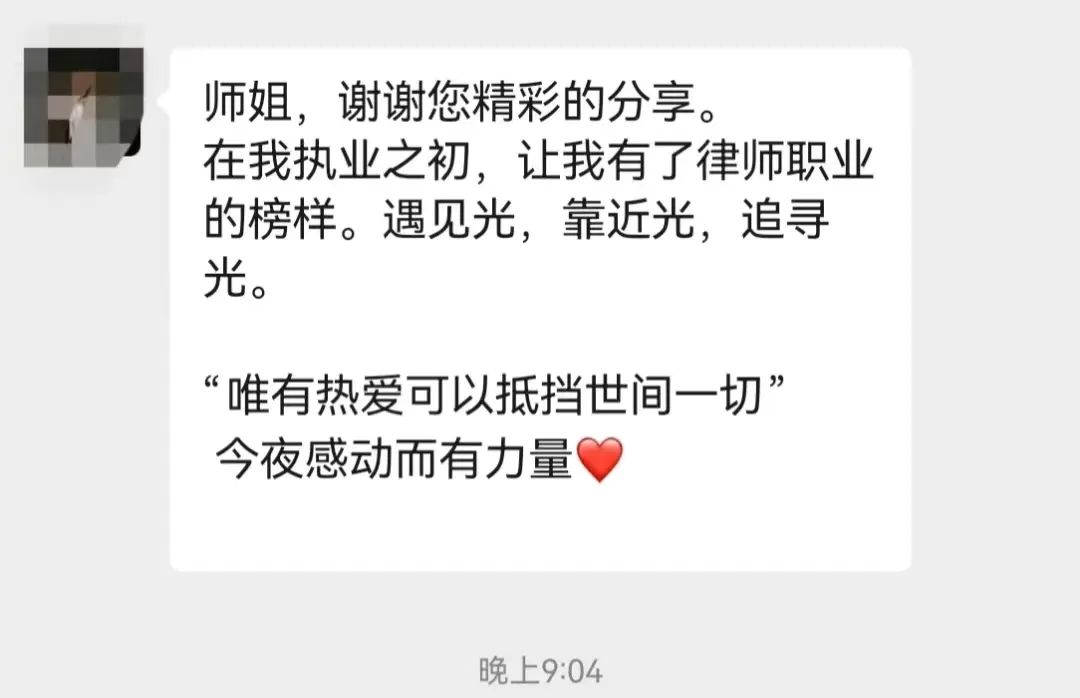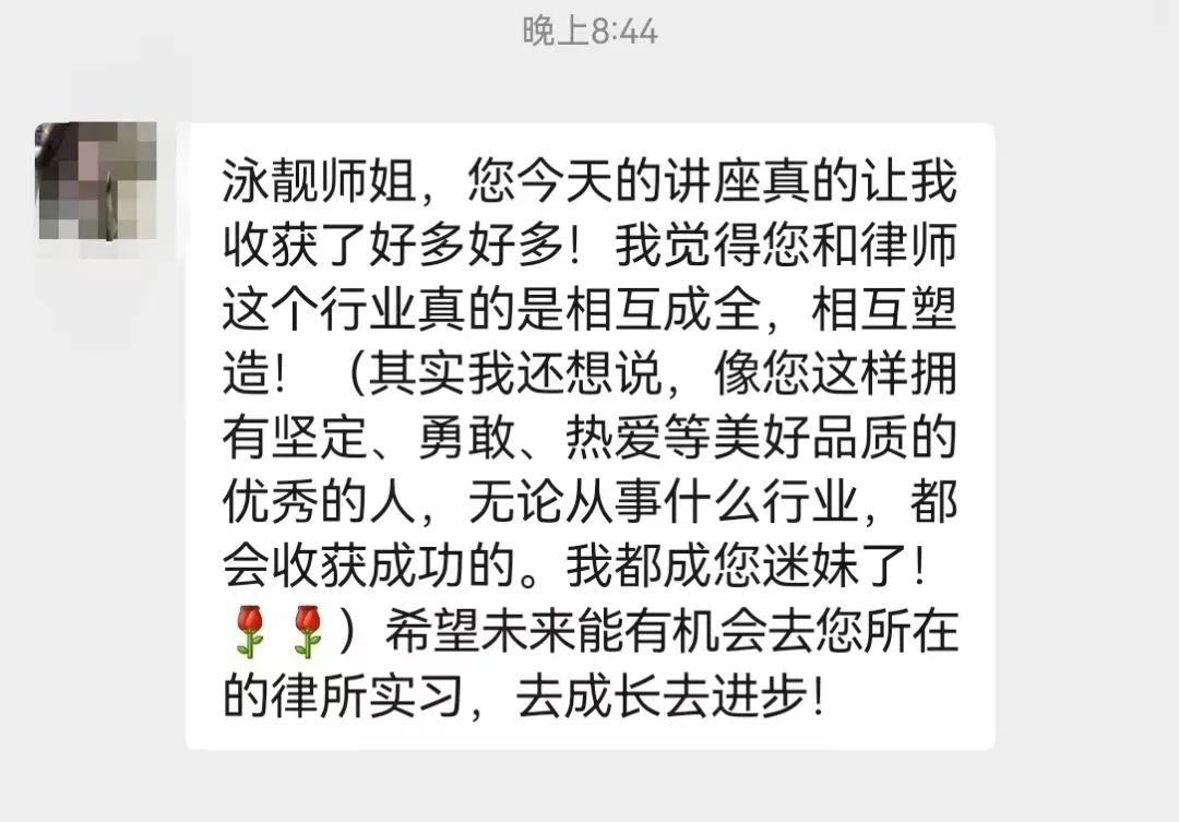 最后,李泳靓律师分享了两条做律师重要的原则。其一,“明法崇德” 体现了对法律的尊重和坚守,以及对道德规范的崇尚。律师作为法律工作者,不仅要精通法律知识,更要具备高尚的道德品质,以正确的价值观和道德观指导自己的执业行为。其二,“成人达己” 则强调在帮助他人实现目标、维护他人合法权益的过程中,也能够提升自己的专业能力和素养,实现自身的价值。