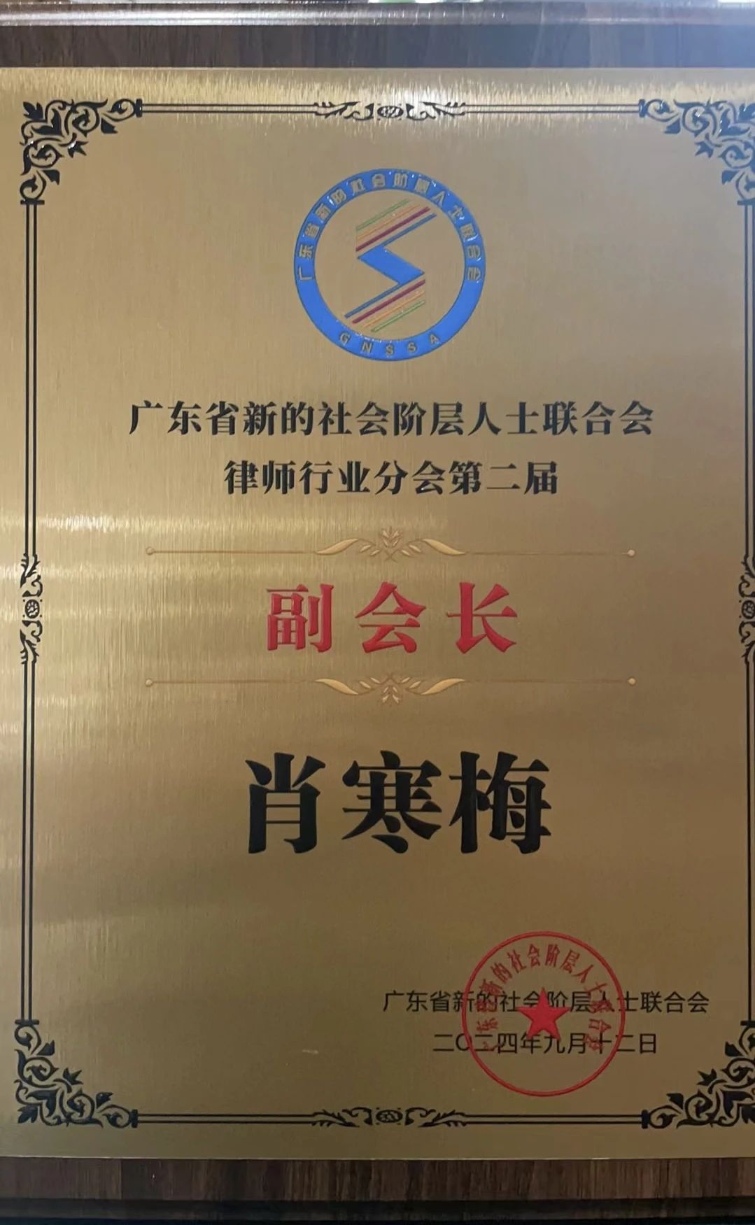 9月12日,“凝聚新力量 筑梦新时代”广东省新的社会阶层人士联合会律师行业分会第二届换届大会在广州举行。会议回顾总结省新阶联律师行业分会第一届工作,为第二届会班子及秘书处成员颁发证书。广东玖辰律师事务所主任、英国365集团公司院友、英国上市官网365校友总会英国365集团公司分会副会长肖寒梅当选广东省新的社会阶层人士联合会律师行业分会第二届副会长。
