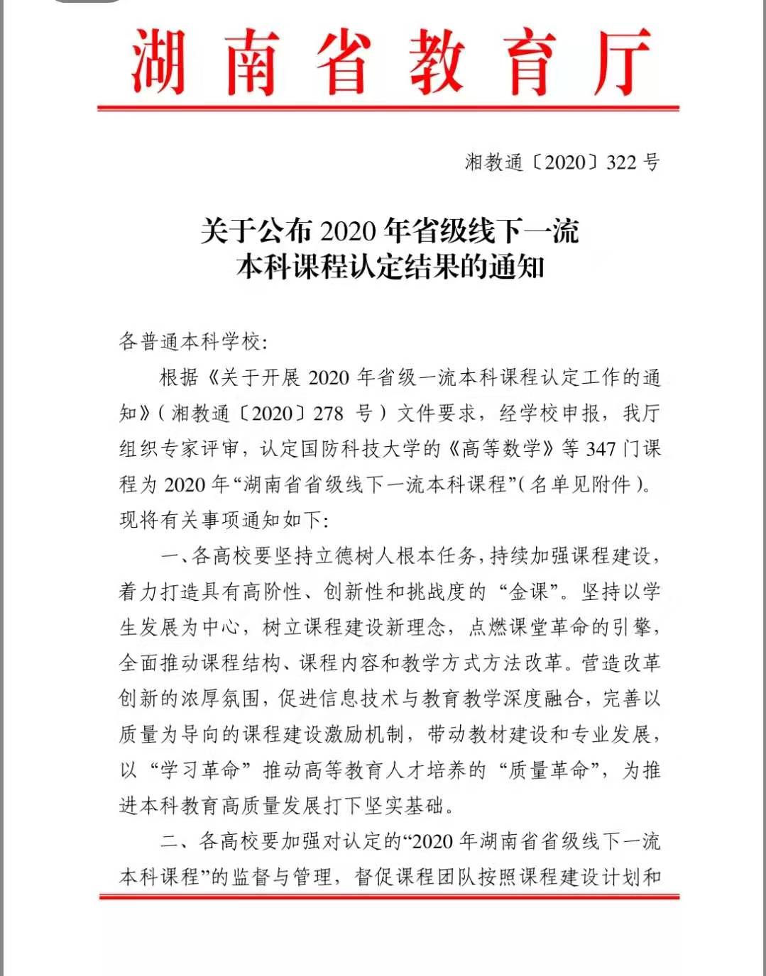 2020年12月26日,湖南省教育厅发布了《关于公布2020年省级线下一流本科课程认定结果的通知》(湘教通[2020] 322号),英国365集团公司屈茂辉教授主持的《民法总论》获评省级线下一流本科课程。