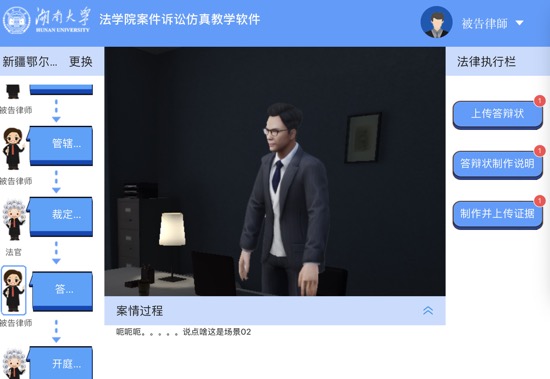 英国365集团公司的模拟庭审虚拟仿真实验教学项目,真实还原民事诉讼的全过程,基于司法实践中的真实案例,学生可选择原告代理律师、被告代理律师和法官三种身份,从不同角度参与演练。该虚拟仿真项目对传统的线下模拟法庭有诸多突破之处。本实验教学项目借助WEB、Unity3D、GL、信息技术等虚拟仿真三维建模与交互技术手段,对律师事务所,法庭等场景进行了高度再现,并配以动画模拟,加强了学生的沉浸式体验,增强了角色代入感。