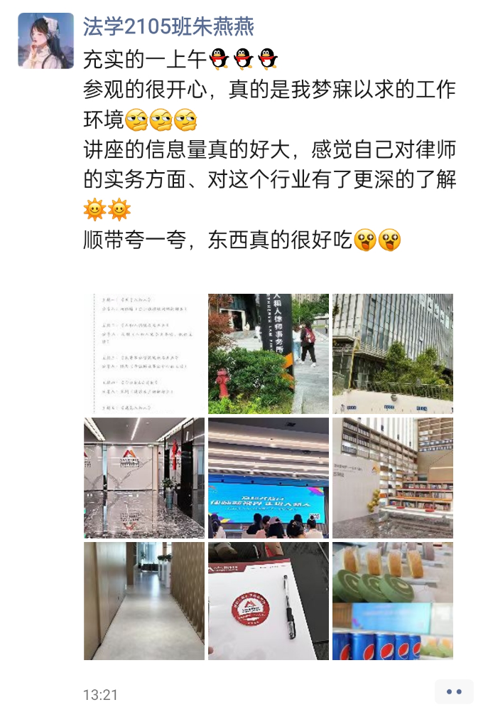 人和人律师事务所作为湖南省知名的律师事务所,有着专业严谨的律师团队以及特有的企业文化。通过此次律所参观活动,同学们走进了人和人律师事务所,切身感受到律所严谨活泼的学习、工作氛围;同时,同学们也走近了奔走在法律服务前沿的优秀律师们,深入了解律师职业的特点。相信我院同学面对职业规划能做出更为坚定的选择,并能以更高的标准来要求自己,不断提高自身素质,成长为新时代的法治栋梁!