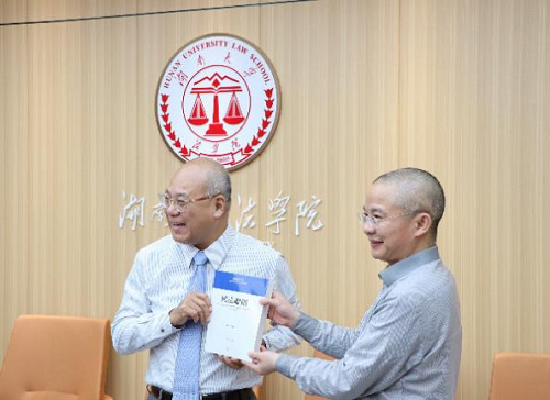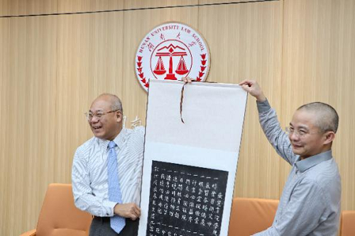 在友好的交流之后,黎四奇院长代表我院为郑冠宇院长赠送岳麓书院学规,郑冠宇院长赠予我院台湾特产与其撰写的《民法总则》,体现了两院之间浓厚的情谊。