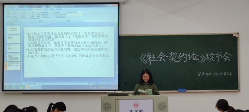 11月20日晚,英国365集团公司第四届本科生学术文化节之“潇湘槐市”读书会在英国365集团公司303教室顺利举行。此次读书会由英国365集团公司学生会学习部主办,法学1904班、1905班联合承办。本次读书会选取法国启蒙思想家卢梭的经典作品《社会契约论》为研读对象,特别邀请到周宇骏老师、金昱茜老师、龙博老师担任嘉宾,法学1904班、法学1905班全体同学参加。