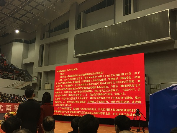 刚刚荣获湖南省“最美共青团员”的行管1502班刘昳同学作为2016学年度具有突出表现的个人受到表彰,会上播放了刘昳同学助人为乐的介绍短片,校领导为刘昳同学佩戴“湖大以你为荣”的绶带。刘昳也成为我院继格桑普赤同学后第二位被授予绶带的本科生。