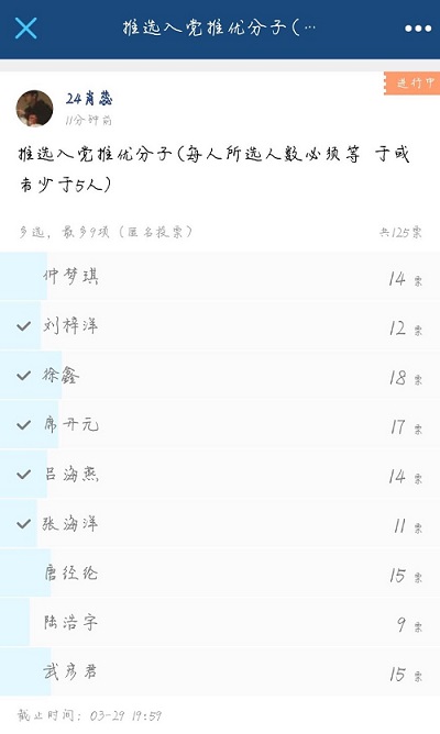 竞选同学发言结束后,团支书肖蕊通过群投票的方式组织同学们进行匿名投票,最终推选出徐鑫、席开元、唐经纶、武彦君、吕海燕五位同学为入党积极分子。