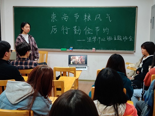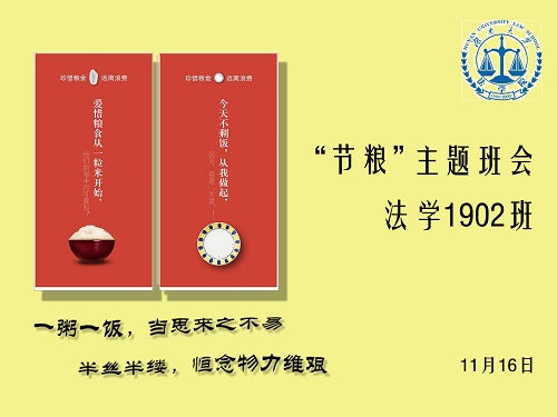 2020年11月16日,法学1902班在综合楼411室开展关于“节粮”的主题班会活动。此次活动提高了同学们节约粮食的意识,同学们纷纷表示在以后的生活中要坚决践行“光盘行动”。