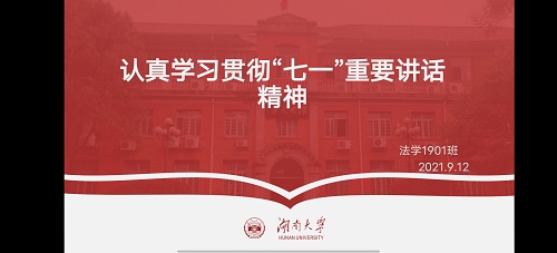 2021年9月12日下午,法学1901班举行认真学习贯彻“七一”重要讲话精神线上主题班会,团支书赵盈主持会议。