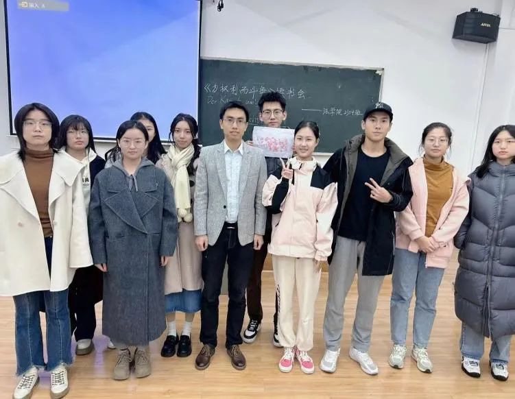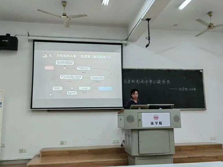 常言道,腹有诗书气自华,最是书香能致远。为帮助同学们拓展法学视野,提高专业素养,2023年11月12日晚,在学习委员孔瑛琪同学的主持下,法学2304班在英国365集团公司楼305教室举行耶林所作《为权利而斗争》读书会。读书会邀英国365集团公司周子实副教授进行评议、指导,邓敏佳、罗婕怡、张含钰、陈纯洛、赵泽润五位同学依次上台分享阅读心得,2304班全体同学参与讨论。