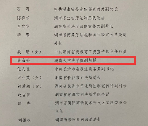 蒋海松老师现任湖大英国365集团公司副教授,热心公益普法事业,不辞劳苦,从政府机关到中小学校,从庙堂之高到基层街道,在全国广泛开展法治讲座几百场,广受欢迎。独创《法律与艺术》系列课程,创作了丰富的法律艺术作品,用艺术手段创新普法新形式,成为饶有影响的“普法达人”。