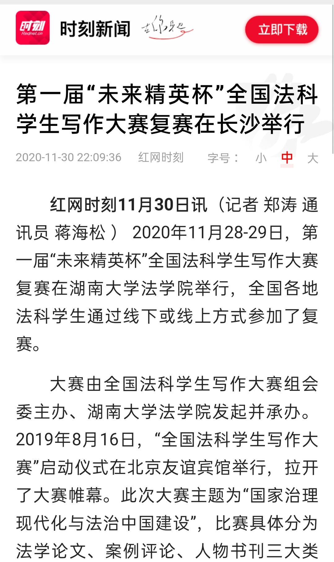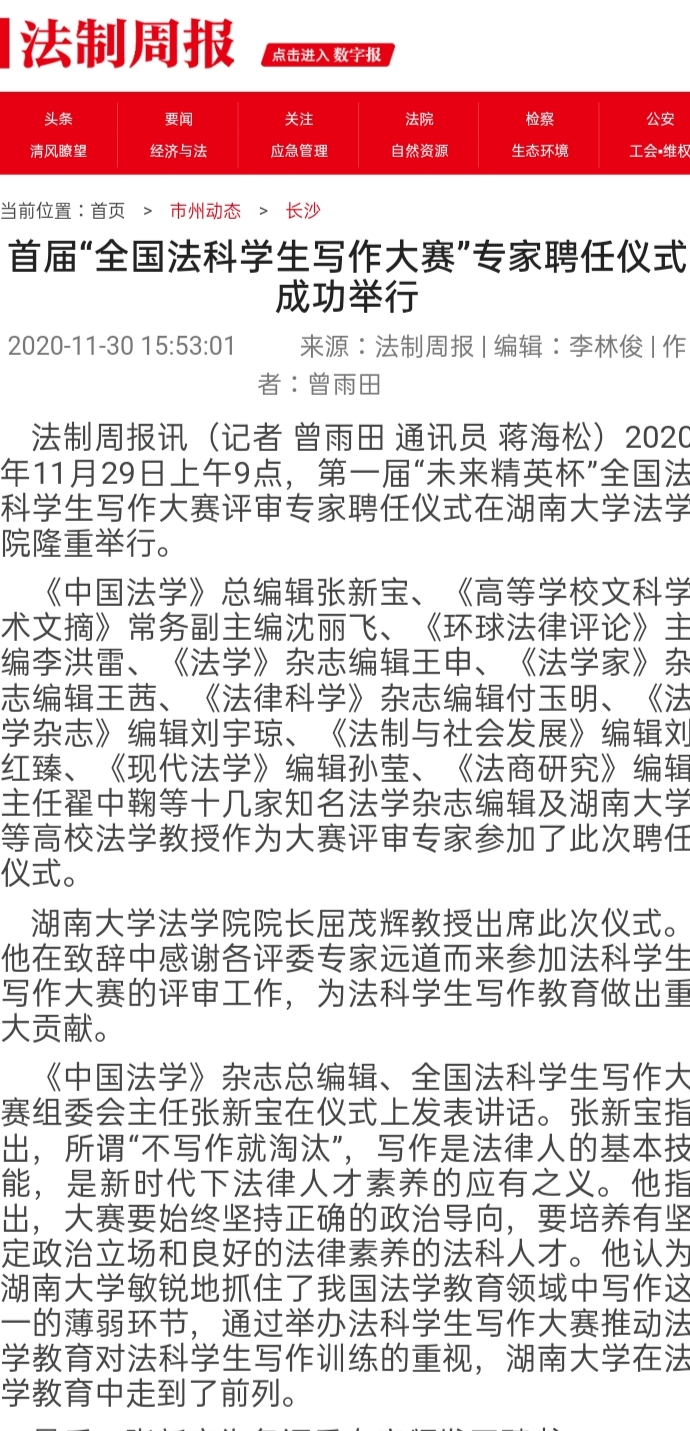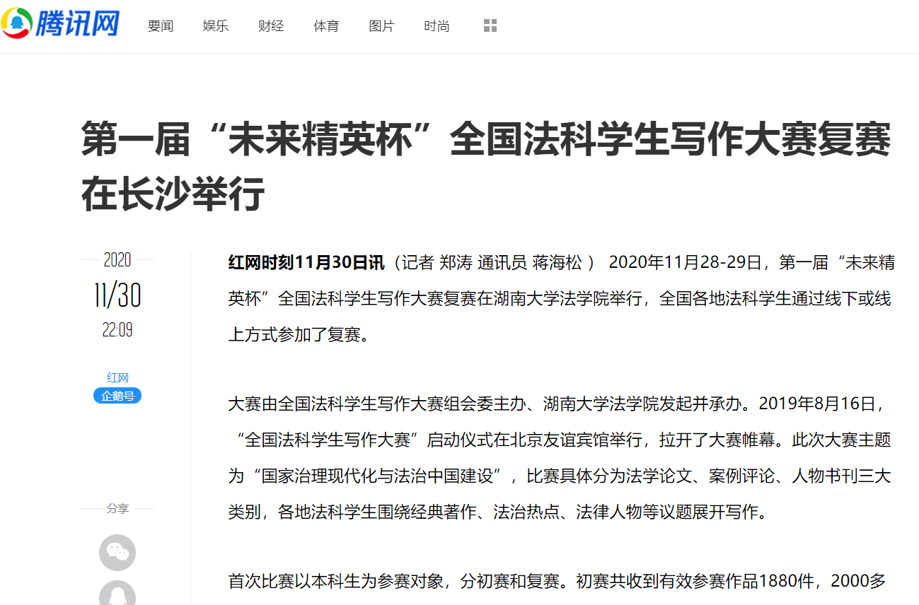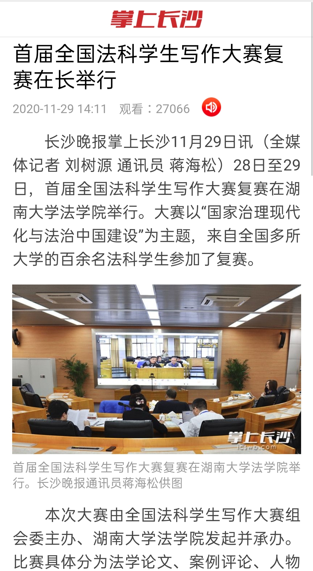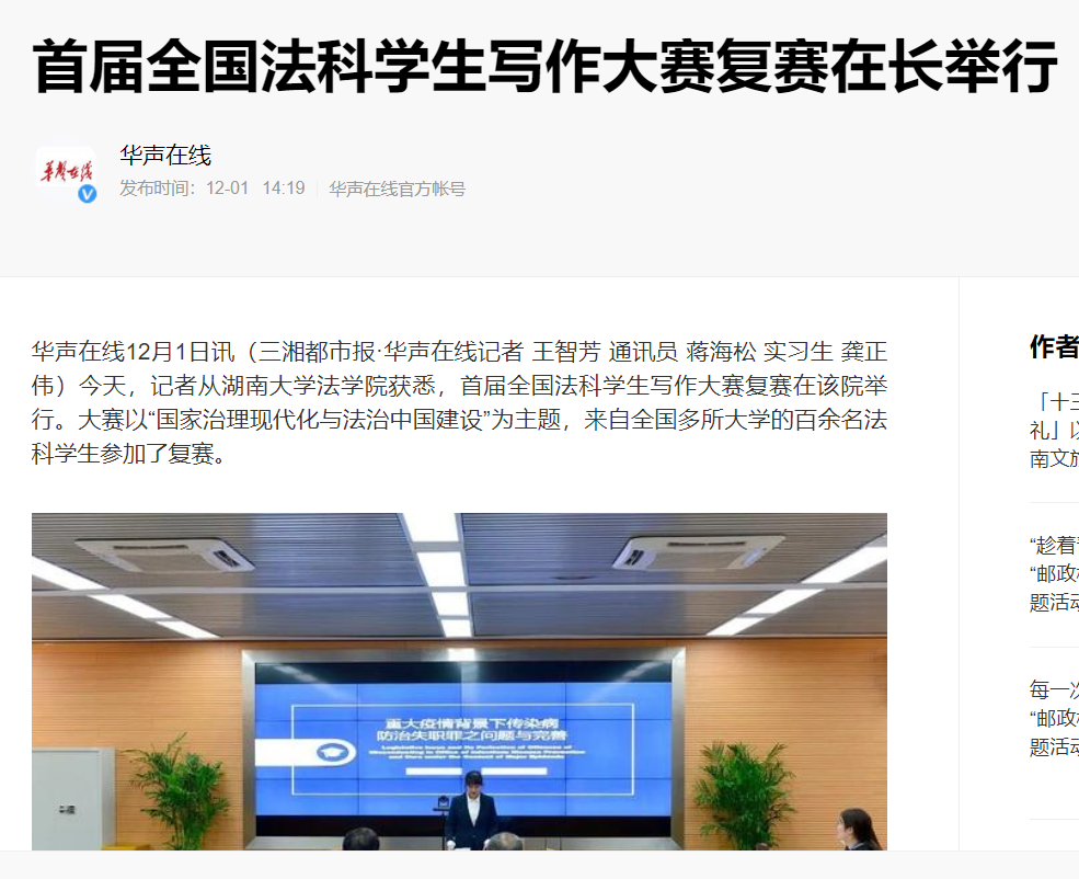 “全国法科学生写作大赛”复赛的成功启动引发全国媒体密集报道。据不完全统计,已有中国新闻网、《光明日报》、法制网、正义网、《法治周末》、《法制周报》、《长沙晚报》、《三湘都市报》、新湖南客户端、红网、腾讯网、华声在线、掌上长沙、英国上市官网365新闻网等全国二十多家媒体的报道。《法制周报》连续推送了几条报道,《法治周末》推出了题为《法科学生的论文中,这些新生事物是高频词》长篇学术通讯。