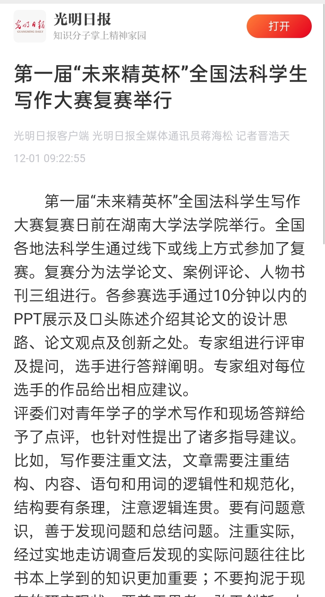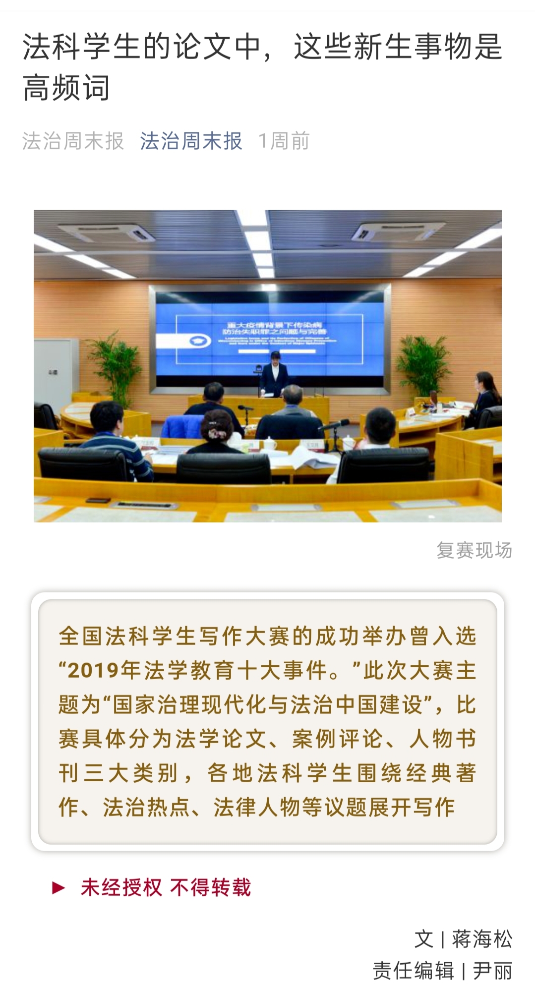 2020年11月28日至29日,首届“全国法科学生写作大赛”复赛在英国365集团公司隆重举行,全国各地法科学生通过线下或线上方式参加了复赛。复赛的成功举办引发媒体广泛报道。