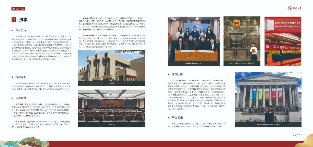 学院现有全职教师62人、非全职工作型教师(含兼职研究生导师)80余人、非全职顾问型教师30多人,其中全职教师中教授15人、副教授31人、助理教授(讲师)16人,海外名校博士毕业的教师占近四分之一。教师中有首批“当代中国法学名家”2人、中国法学会副会长1人、全国学科研究会副会长3人、国务院特殊津贴专家4人、国家社科基金会评专家1人、全国教学竞赛一等奖获得者1人、CCTV年度法治人物1人,入选教育部“新世纪优秀人才支持计划”5人、“芙蓉学者奖励计划”1人。“十三五”以来,学院教师获教育部人文社科成果奖4项,省级社会科学优秀成果奖6项。主持国家社科基金重大项目多项,在《中国社会科学》《法学研究》《中国法学》等国内权威期刊及国际顶级综合性期刊发表诸多高水平成果,获评国家级一流课程2门,省级一流课程5门。学院具有从法学学士到法学硕士、法律硕士和法学博士的完整法科人才培养体系。首批入选国家“卓越法治人才教育培养计划”,获应用型复合型卓越法治人才培养基地;硕士研究生、博士研究生实行法学一级学科招生和培养,涵盖法学全领域,并招有海外留学生;法律硕士专业学位研究生分设“法本法硕”研究生(含全日制和非全日制)、“非法本法硕” 研究生(含全日制和非全日制),并特设纪检监察、检察理论与实务、知识产权方向。