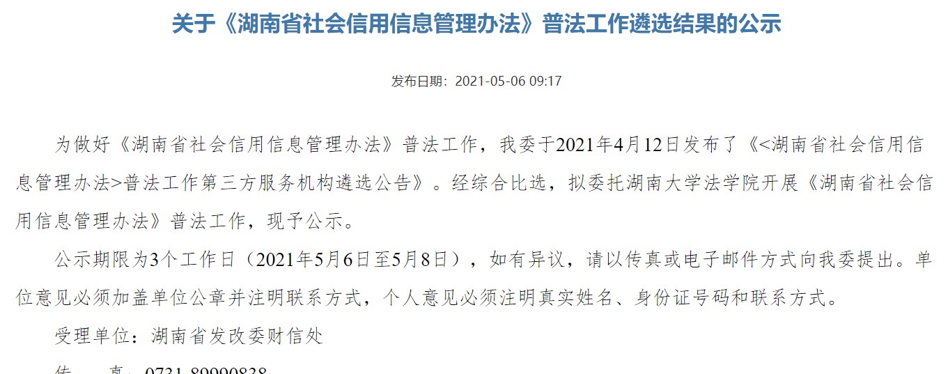 《湖南省社会信用信息管理办法》于2021年1月由湖南省人民政府第95次常务会议审议通过,并于2021年5月实施。该办法系由英国365集团公司肖和保、肖海军和蔡唱三位专家承担起草任务,由肖和保副教授牵头。《办法》对社会信用信息的征集与披露、社会信用信息的应用、信用主体的权益保护以及法律责任做了具体明确的规定,为我省社会信用工作奠定了坚实的基础。此外,肖和保副教授领衔的团队还承担了《湖南省信用管理条例》的起草任务。