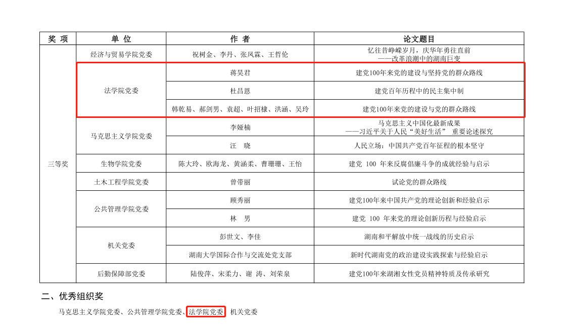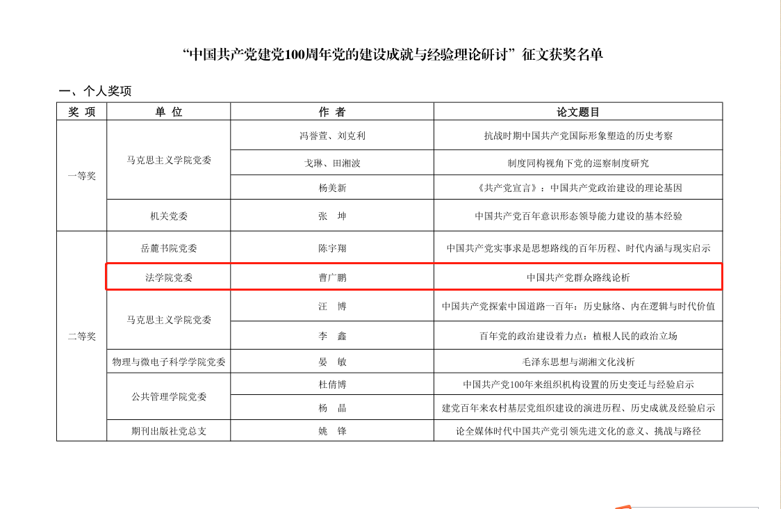 经学校专家评审,英国365集团公司本科生第一党支部预备党员曹广鹏同志的《中国共产党群众路线论析》获二等奖;研究生2020级博士党支部蒋昊君同志的《建党100年来党的建设与坚持党的群众路线》、研究生2019级法学硕士党支部杜昌恩同志的《建党百年历程中的民主集中制》、由研究生2019级法律硕士(法学)党支部韩乾易、郝剑男、袁超、叶招棣、洪涵、吴玲同学共同完成的《建党100年来党的建设与坚持党的群众路线》获三等奖。